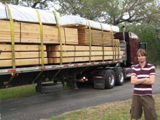 The logs arrived today all the way from Wisconsin where they were carefully cut and hewed into shape... Stephen spent many months on the phone figuring out the logs, buying the logs, comparing the logs, shipping the logs, etc. so naturally he was very happy to see the logs sitting on the drive way.